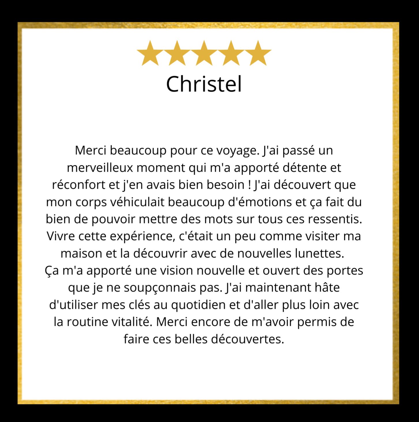 Ainsi à chaque étape, tu es invitée à venir porter ton attention sur ce qui émerge en Toi, à prendre le temps de le formuler par écrit, à rester centré sur ce que l'étape peut te révéler comme Clé perso et à la consigner pour pouvoir en faire usage dans ton quotidien.